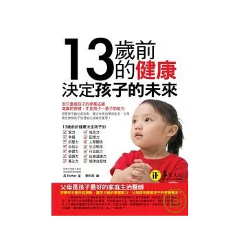 13歲的前健康,將是決定孩子未來的最大關鍵!在《13歲前的健康決定孩子的未來》中,作者以專業醫師、母親的身份,針對飲食、運動、睡眠、親子互動……多方面而詳細的告訴所有父母:「愛孩子,請從培養他們的健康開始!」