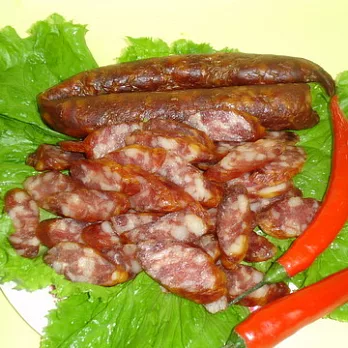 溫和香辣的燻香腸,經清蒸後,切片,一咬下去,濃濃的肉香,越嚼越香。適口的辣味,慢慢的在口腔中溫暖你的心,讓你有一種 滿 足感。